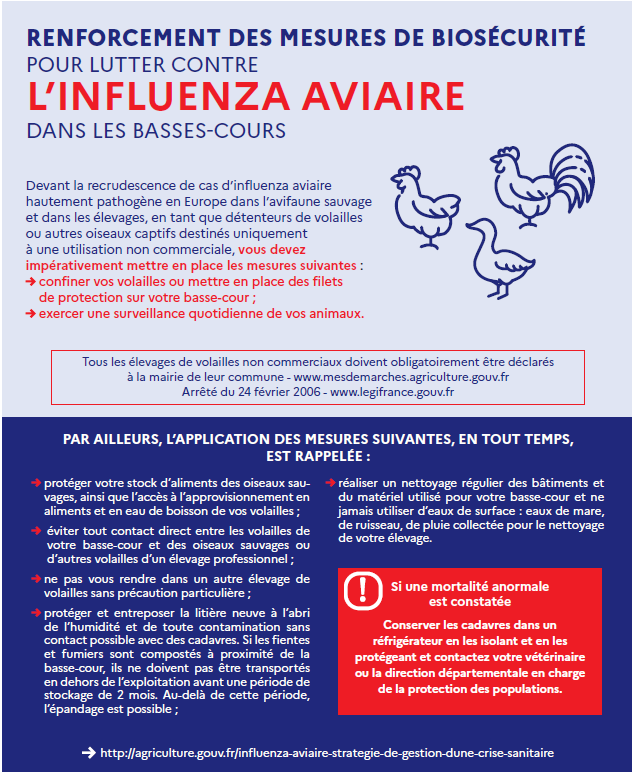 La préfecture a décidé de placer l'intégralité du département de Maine-et-Loire en zone de contrôle temporaire en raison de la circulation du virus influenza aviaire hautement pathogène dans la faune sauvage. L'arrêté DDPP n°2022-1061 détermine cette zone de contrôle temporaire et les mesures applicables. Les principales mesures fixées par cet arrêté concernent : 1/ Le recensement des détenteurs d’oiseaux (les non-professionnels possédant des basses-cours auprès de leur mairie, les professionnels, quelle que soit la taille de leur exploitation, auprès de la DDPP). 2/ La prévention avec la mise à l’abri de tous les oiseaux, détenus par des particuliers ou des professionnels, dans des bâtiments fermés ou sous des filets et la protection des points d’abreuvement et d’alimentation dans des lieux fermés. Il s’agit de limiter au maximum les possibilités de contact entre l’avifaune sauvage et les oiseaux domestiques. 3/ La surveillance : en plus de la déclaration obligatoire de toute mortalité anormale pour laquelle l’influenza aviaire ne peut être exclue et qui donne lieu à des mesures de suspicion traitées par les vétérinaires sanitaires et la DDPP Toutes ces mesures de surveillance ont pour but de déceler le plus précocement possible l'éventuel passage du virus H5N1 de l’avifaune sauvage autochtone dans laquelle il circule, aux élevages d’oiseaux domestiques. Retrouvez l'arrêté ici Flyer QUE FAIRE EN CAS D’OISEAUX COMMENT PROTEGER SAUVAGES TROUVÉS MORTS ? SA BASSE-COUR ? |