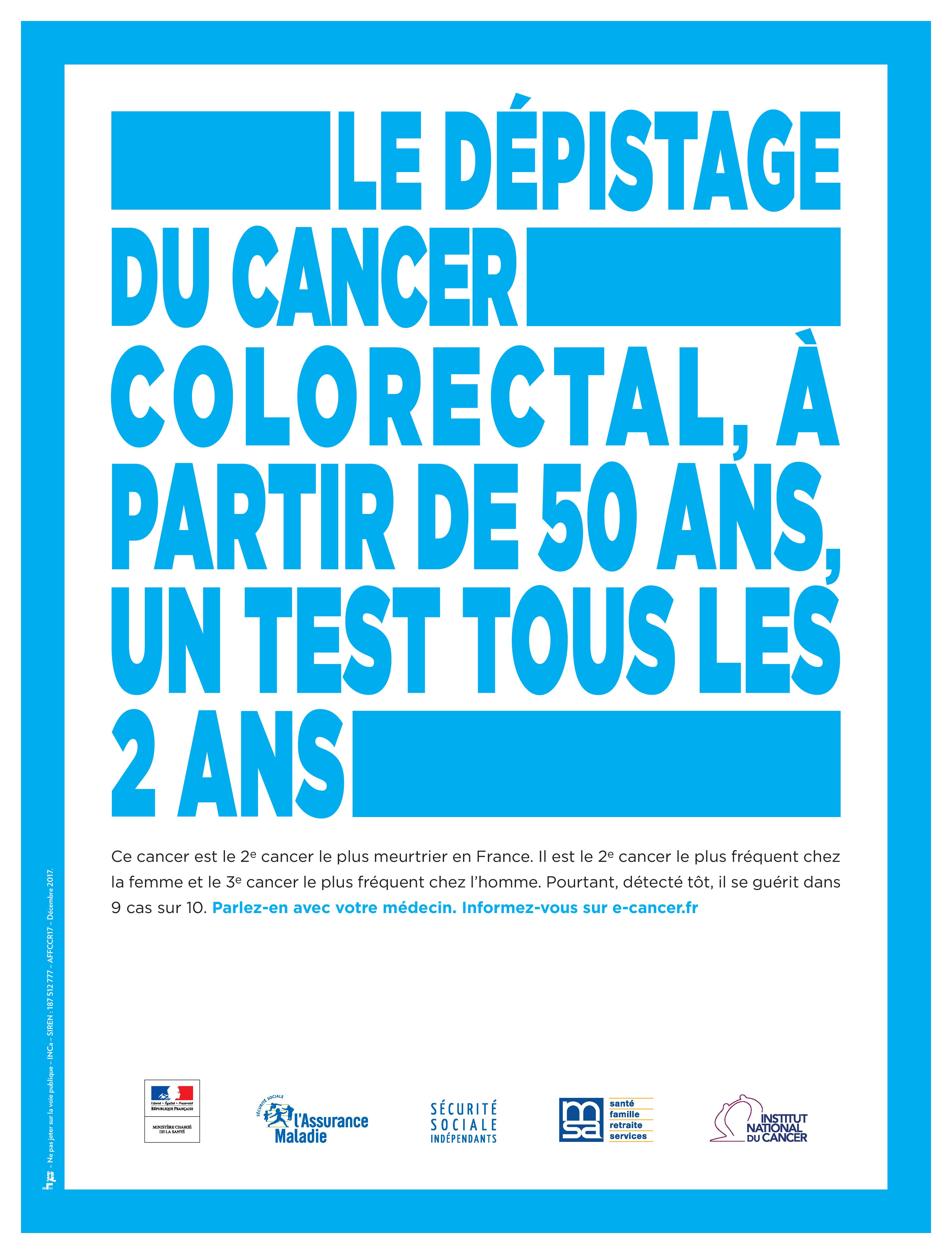 Le cancer colorectal est responsable de plus de 17 000 décès par an. Pourtant, s'il est détecté tôt, il se guérit dans 9 cas sur 10.Le cancer du côlon et du rectum se situe au 3ème rang des cancers les plus fréquents en France, le nombre de nouveaux cas estimés en 2018 est de 43 336*. Au cours de sa vie, 1 personne sur 30 y sera confrontée.Les bénéfices du dépistage :Plus un cancer est détecté tôt, moins les traitements sont lourds et meilleures sont les chances de guérison. Se faire dépister régulièrement permet de détecter et de traiter des polypes à un stade précoce de leurs développements, avant qu'ils n'évoluent vers un cancer.Le dépistage proposé aux hommes et aux femmes de 50 à 74 ans consiste en la réalisation d’un test immunologique qui va rechercher la présence de sang humain non visible dans les selles. Le test rapide et efficace est à faire chez soi. Si son résultat est positif (4 % des cas), une coloscopie sera alors prescrite.Le test est simple, indolore, rapide et prise en charge à 100%Pour en savoir plus sur le cancer colorectal, rendez-vous sur le site de l'INCa :